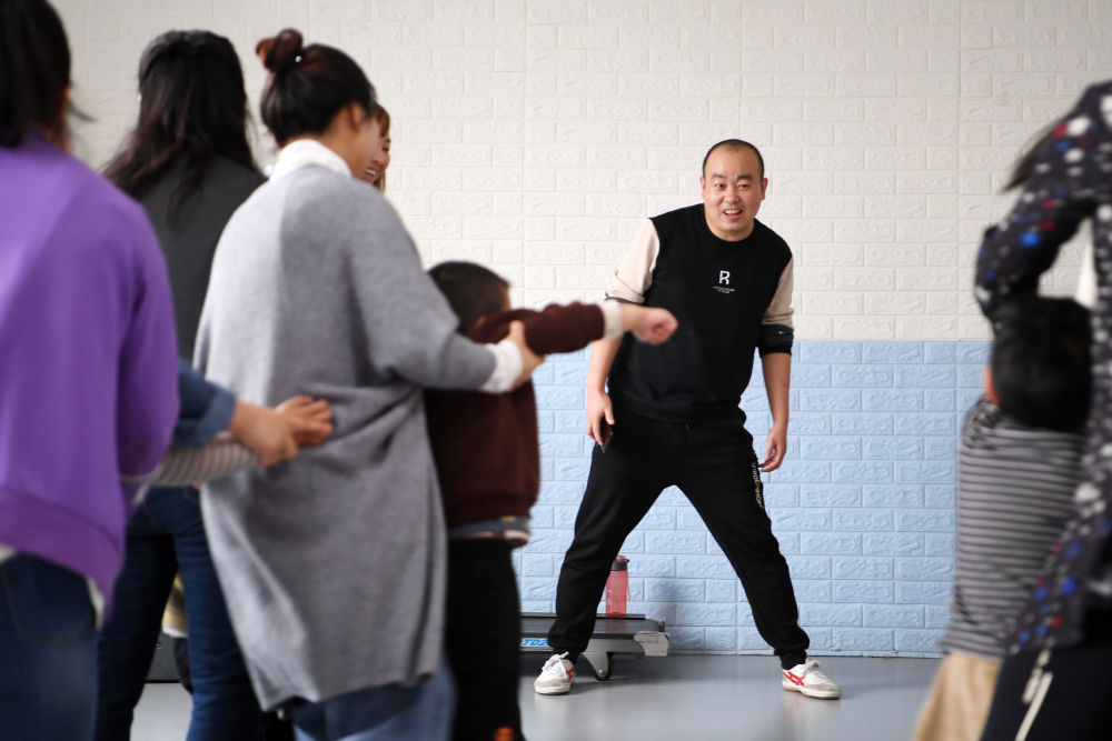 ↑ 丁强(后排左二)引导孩子开展体育运动。