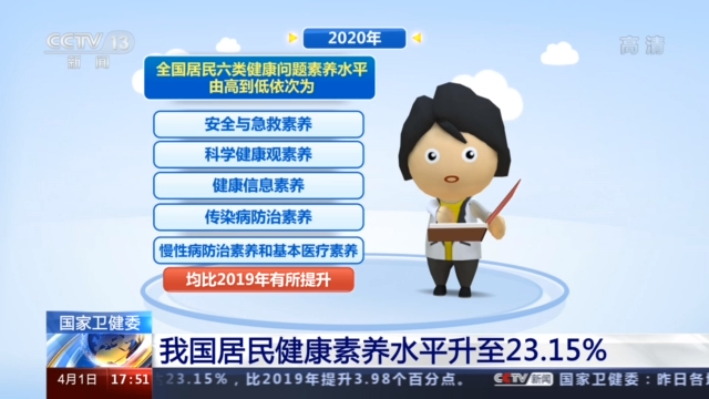国家卫健委今天发布的监测结果显示,2020年我国居民健康素养水平达到23.15%,比2019年提升3.98个百分点,增长幅度为历年最大。