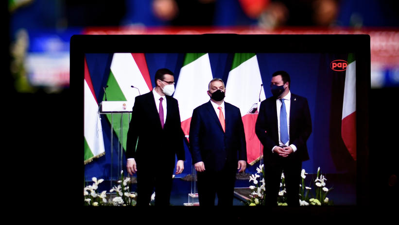△由左至右:波兰总理莫拉维茨基、匈牙利总理欧尔班及意大利联盟党领导人萨尔维尼