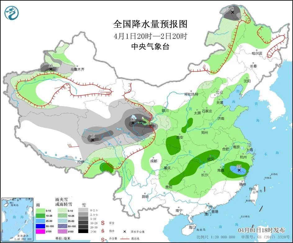 4月1日20时至2日20时,内蒙古东北部、黑龙江西北部、新疆伊犁河谷和南疆盆地山区、西藏北部、西北地区中部、甘肃南部等地部分地区有小到中雪或雨夹雪,其中,内蒙古东北部、黑龙江西北部、新疆伊犁河谷、青海东部和南部、甘肃中南部等地局地有大到暴雪。内蒙古东部、东北地区西部、新疆南疆盆地、西藏东南部、西北地区东部、华北大部、黄淮、江淮、江汉、江南大部、西南地区东部和北部、广西东北部等地部分地区有小到中雨,局地大雨。