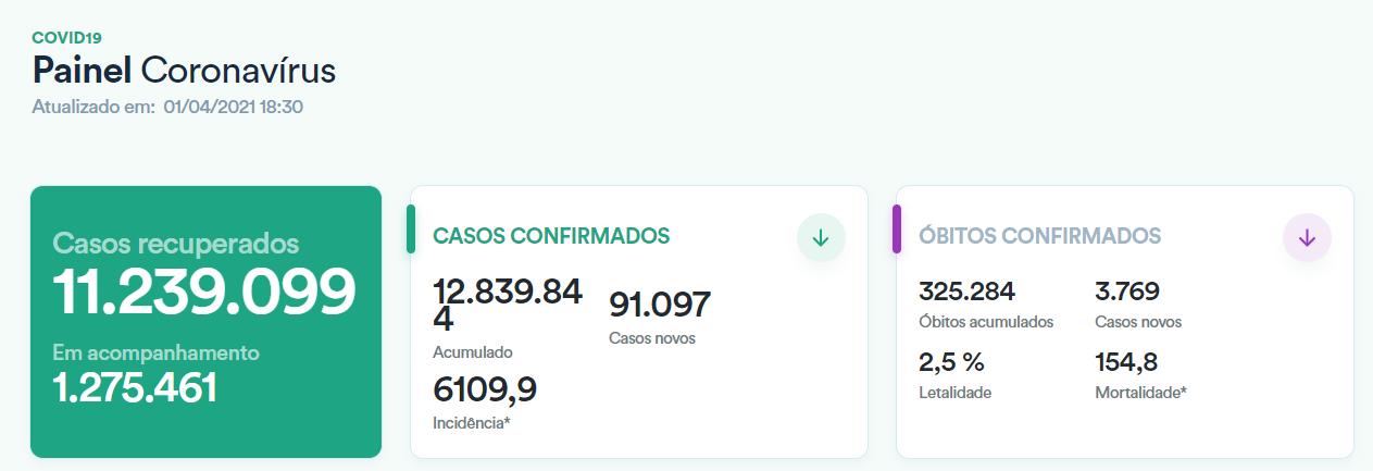 截至当地时间4月1日,巴西累计新冠肺炎确诊病例12839844例,较前一日新增91097例;累计死亡病例325284例,较前一日新增3769例。
