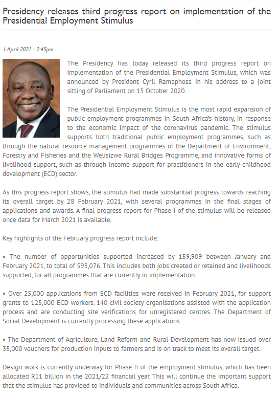 该“就业刺激计划”是南非对疫情下南非经济疲软,失业率迅速攀升(2020年第四季度失业率32.5%)所做出的回应。该“就业刺激计划”通过在环境、林业、渔业、道路、桥梁等政府公共服务部门增加就业岗位来解决该国失业率居高不下问题,同时也鼓励私营企业增加就业岗位。南非总统府宣布该计划实施以来已增加593076个就业机会,其中仅2021年2月就增加了159909个就业机会。