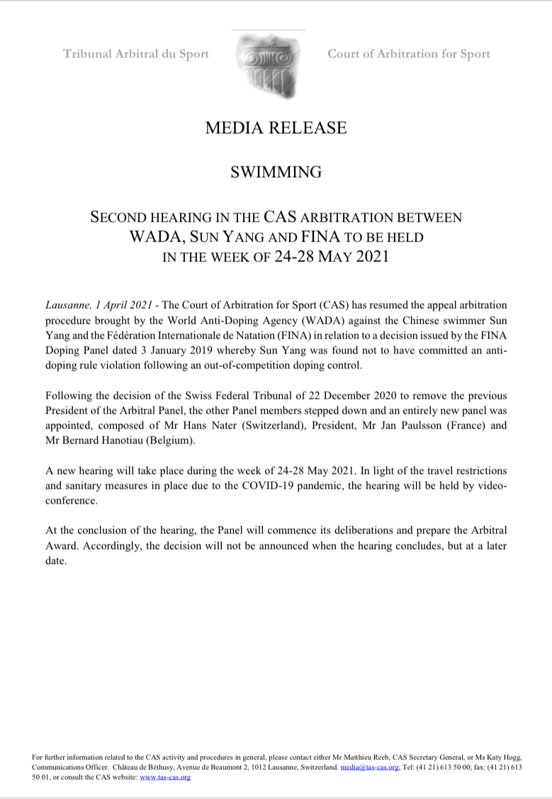 新华社北京4月2日电(记者周欣 马向菲)瑞士当地时间4月1日,国际体育仲裁法庭发布通告,世界反兴奋剂机构与孙杨和国际泳联的第二次听证会将于5月24日至28日进行,并组成了新的三人仲裁小组。