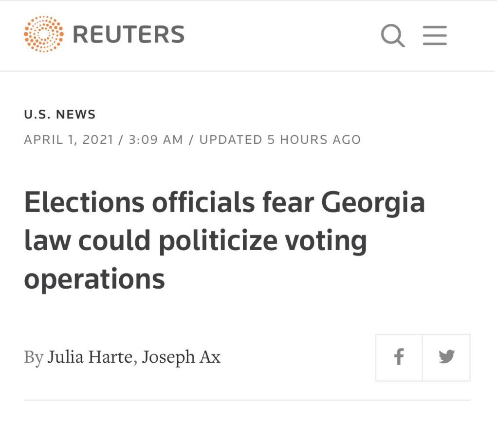 △路透社报道,选举官员担忧佐治亚州的投票新规导致本应平等的选举过程政治化