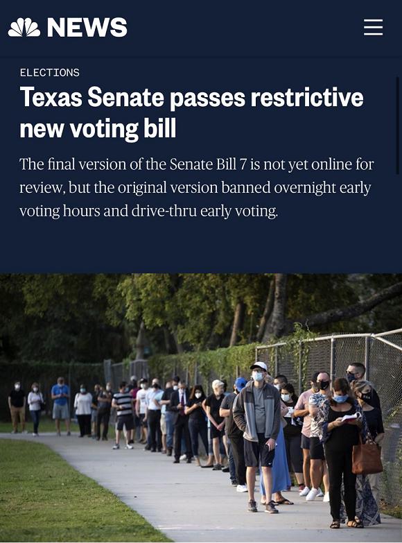 △美国全国广播电台报道,得克萨斯州参议院通过的新投票法案,将极大抑制选民投票积极性