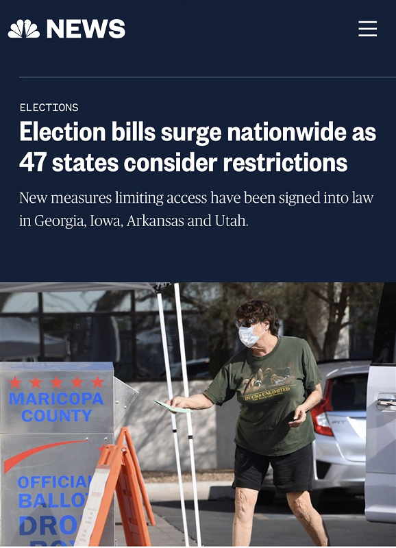 △美国全国广播公司报道,全美有47个州正在试图推进投票相关法案,以收紧投票资格、抑制投票积极性