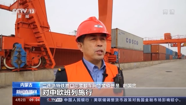二连浩特铁路口岸装卸车间货装值班员 赵国忠: 对中欧班列施行“优先受理、优先配车、优先装载、优先发运”的政策,压缩班列装卸时间,实现了班列运输效率最大化。(总台记者 刘晓波 阮超 )