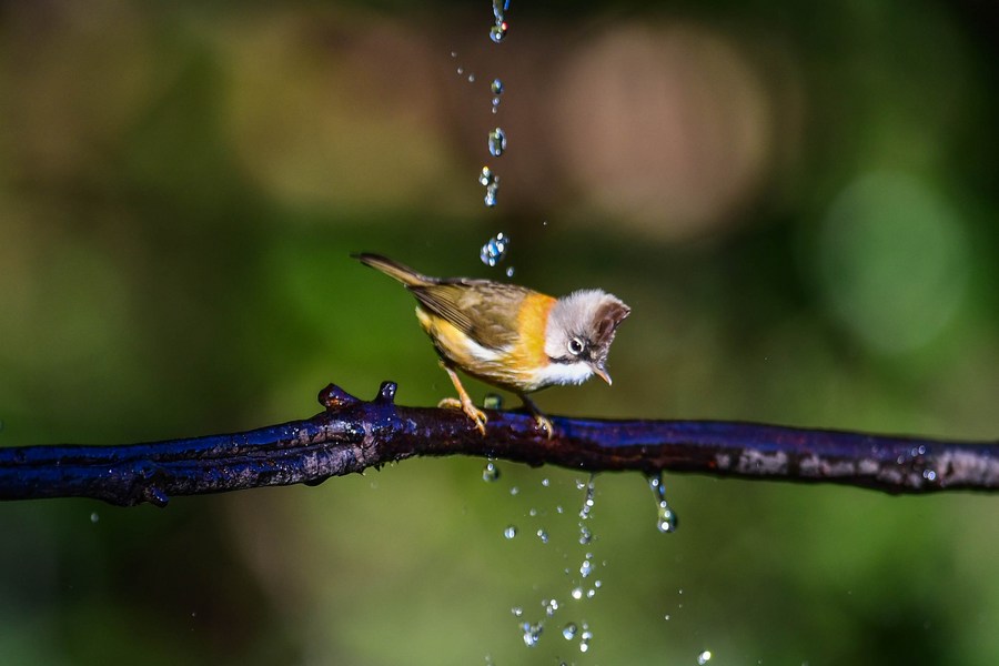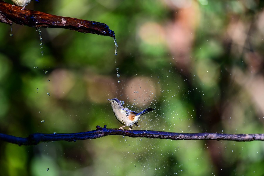 在保山市隆阳区百花岭村的山林里,一只小鸟在洗澡。新华社记者 胡超 摄