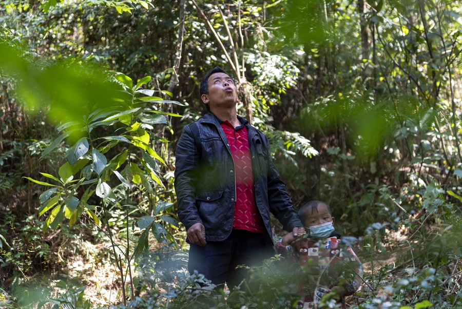 在怒江州泸水市鲁掌镇三河村,李中华带着儿子在自家“鸟塘”边的林子里唤鸟(3月13日摄)。新华社记者 陈欣波 摄