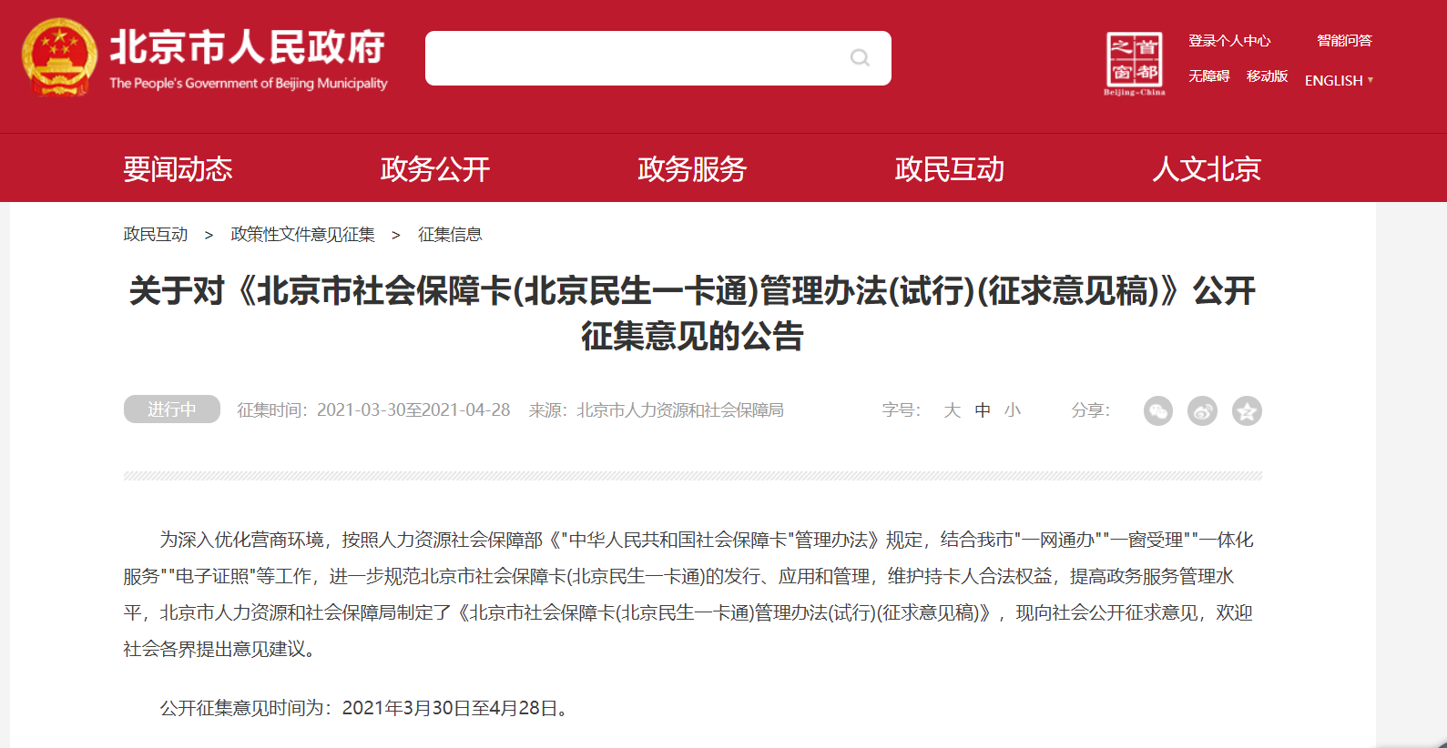 近日,《北京市社会保障卡(北京民生一卡通)管理办法(试行)(征求意见稿)》面向社会征求意见。征求意见稿旨在进一步增加和优化社保卡功能,实现多卡合一、一卡通用,最大限度方便参保者使用。