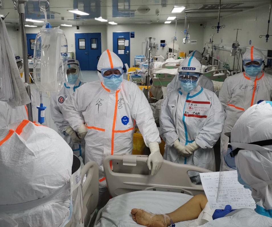 △管向东在防护服上写着“管爷”,正在会诊病人