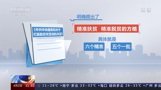 《中共中央国务院关于打赢脱贫攻坚战的决定》明确提出了精准扶贫、精准脱贫的方略,具体就是六个精准和五个一批。六个精准是指扶持对象精准、项目安排精准、资金使用精准、措施到户精准、因村派人精准、脱贫成效精准。五个一批是指发展生产脱贫一批、易地搬迁脱贫一批、生态补偿脱贫一批、发展教育脱贫一批、社会保障兜底一批。
