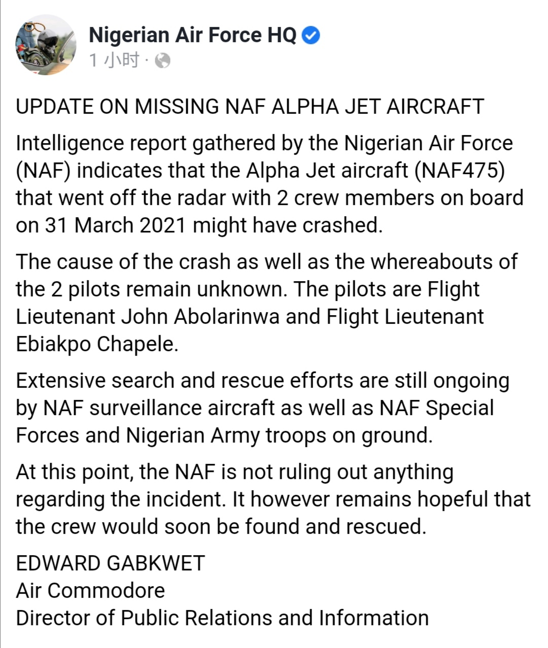 尼日利亚空军公共关系和信息总监加布克韦特准将2日通过尼空军司令部社交媒体账号发布消息称,3月31日下午从雷达上消失的一架“阿尔法喷气式”战机可能已经坠毁,机上两名飞行员目前生死不明。尼空军侦察机、空军特种部队和陆军地面部队的大范围搜索和救援工作仍在进行,不排除任何有关事件(的可能性),飞行员被找到并获救的希望仍然存在。