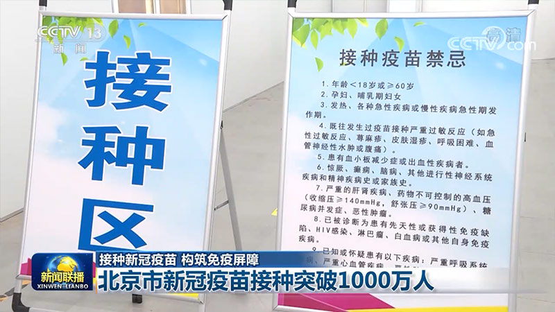 央视网消息(新闻联播):北京市高度重视疫苗接种工作。截至今天(4月2日)下午3时,全市累计接种人数突破1000万人,累计接种新冠疫苗1600多万剂次。目前,北京市检验检疫、交通运输、社区工作者等九类重点人群第2剂完成率达到96.5%,医疗战线医务人员接种率接近九成。顺义区、西城区、大型机场等在接种率高的企业和门店张贴了“安心标”,便于顾客识别。北京经开区创新疫苗接种工作方式,在企业设置临时接种点,将疫苗接种服务送进企业。各个疫苗接种点都开通了老人接种“绿色通道”,60岁及以上人群接种突破67万人,最大年龄接种者为100岁。