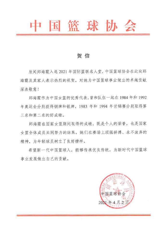 “欣闻郑海霞入选2021年国际篮联名人堂,中国篮球协会在此向郑海霞及其家人表示热烈的祝贺,对她为中国篮球事业做出的卓越贡献深表敬意!”中国篮协在贺信中写道。