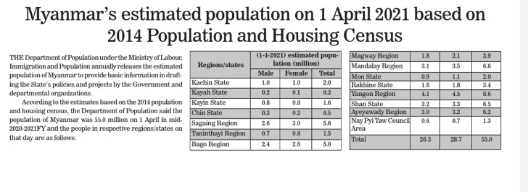据缅甸官方媒体《环球新光报》报道,缅甸劳工、移民和人口部人口司以2014年缅甸全国人口普查数据为基础,计算并公布了缅甸2021年最新的人口统计数据。截至2021年4月1日,缅甸全国人口总数为5500万。