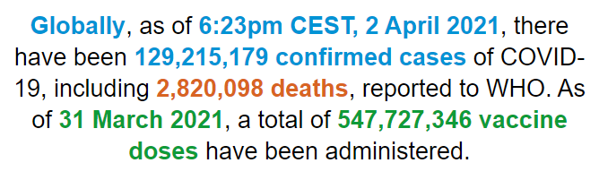 根据世卫组织最新实时统计数据,截至欧洲中部夏令时间4月2日18时23分(北京时间4月3日0时23分),全球累计新冠肺炎确诊病例129215179例,累计死亡病例2820098例。4月2日全球新冠肺炎确诊病例新增659917例,死亡病例新增11626例。(总台记者 朱赫)