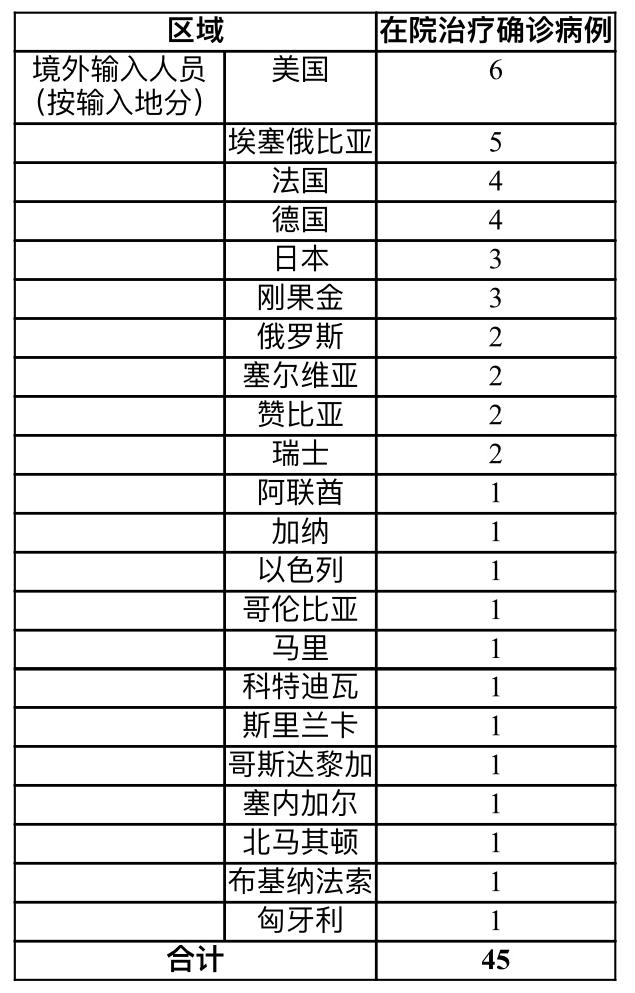 截至2021年4月2日24时,累计境外输入确诊病例1520例,出院1475例,在院治疗45例。现有待排查的疑似病例2例。