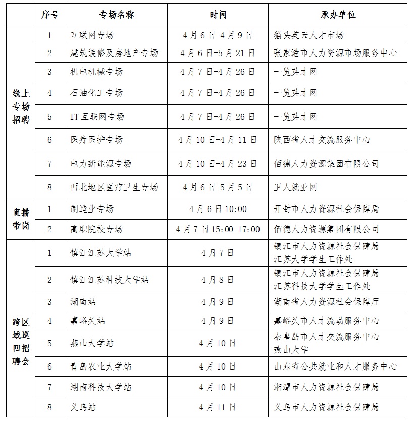 【线上活动10场】包括互联网、机电机械、石油化工、医疗医护等8个专场招聘会和2场直播带岗。截至3月26日,已有1286家用人单位提供约1.2万个岗位,后期将有更多用人单位陆续加入。