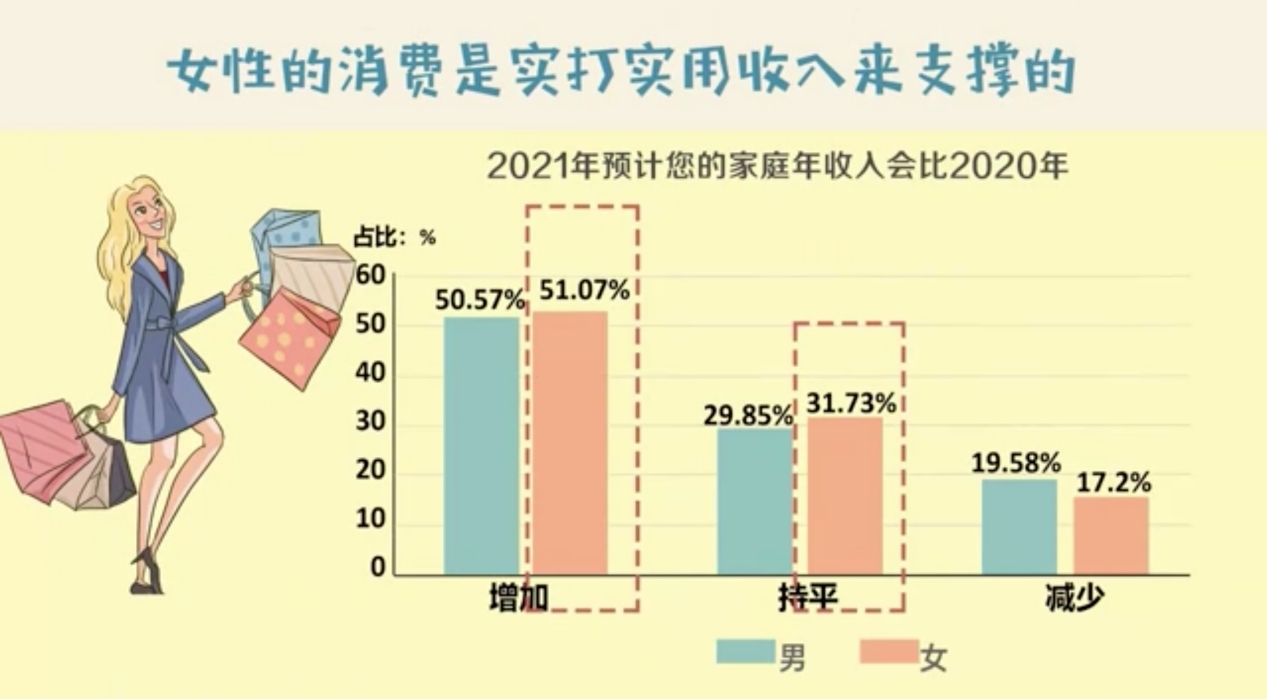 女人们消费的底气从哪来?大调查发现,预计今年收入跟去年持平和增加的女性数量都高于男性,女性的消费也是实打实用收入来支撑的。