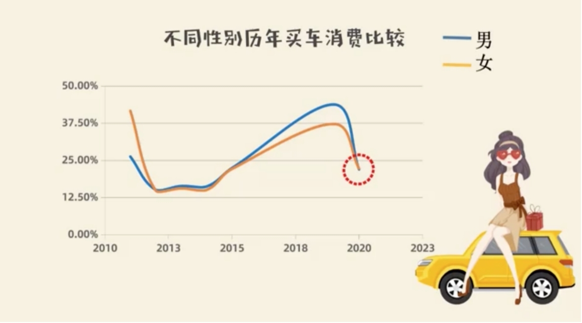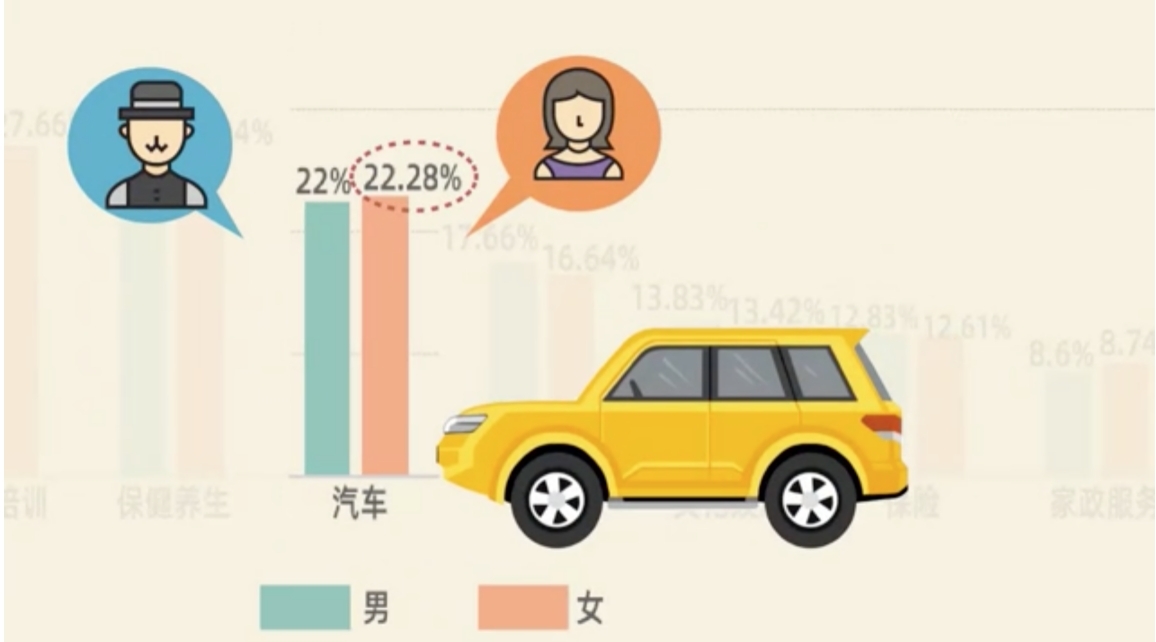 大调查发现,2020年,女性的购车消费达到22.28%,已经超过男性(22.00%)。