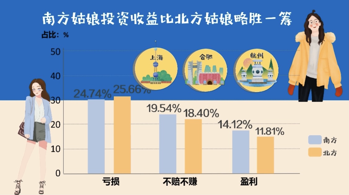 大调查还通过南北方女性证券市场投资对比发现,南方姑娘更会精打细算,投资收益比北方姑娘略胜一筹。36个大中城市中,上海、合肥、杭州这三个城市的女性投资赢利比例最高。