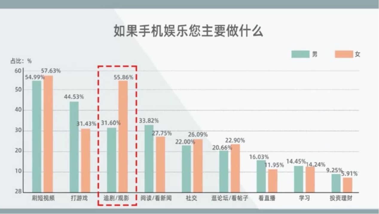 说到刷手机,女人们可不仅仅是在网购。她们的手机娱乐时间都在干什么?大调查发现,女人在追剧观影方面的喜爱竟然高出男性24个百分点!真是追剧狂魔啊。