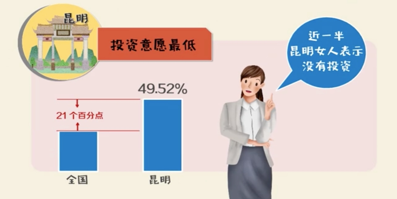 有热衷的,就有不关心的,在众多女性中,昆明女人的投资意愿最低,她们选择不投资的比例达49.52%,近一半的昆明女人表示没有投资,高于全国女性不投资平均水平21个百分点。紧随其后的是西安和呼和浩特的女性朋友。