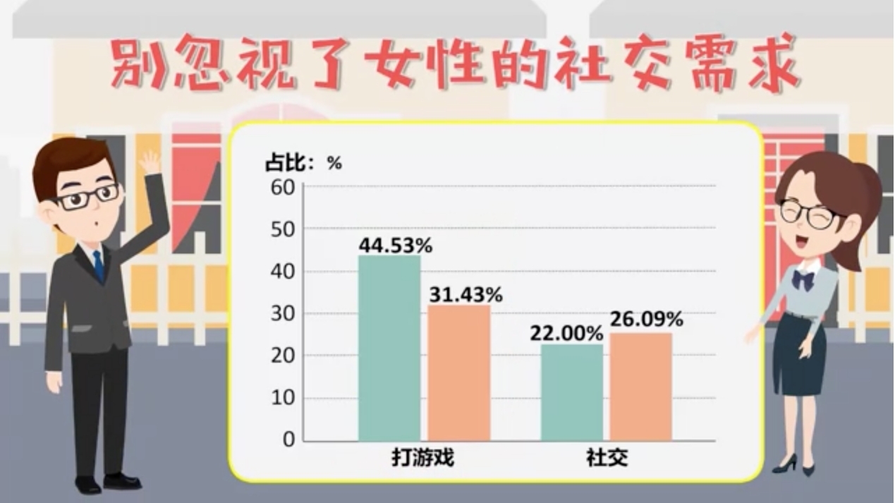 此外,在手机上选择社交的女性比例也明显高出男性4个百分点,相比之下,男人们在手机上闷头打游戏的比例要高出女性13个百分点,还是快快放下手机吧,别忽视了女性的社交需求。
