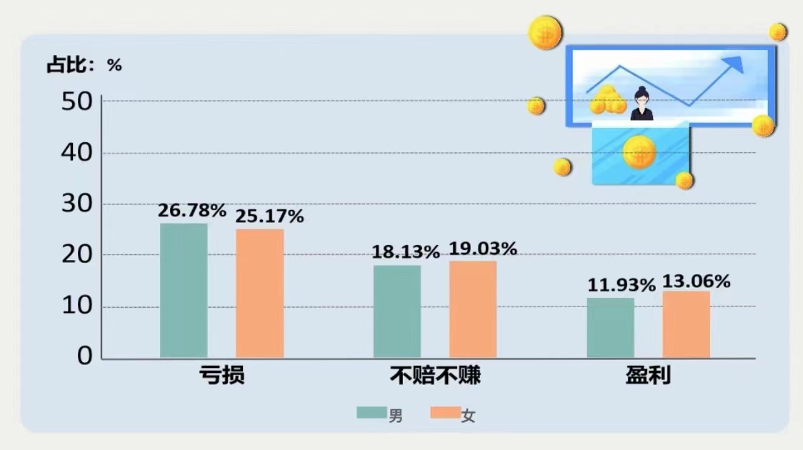 女人们的证券投资收益如何呢?大调查发现,有投资行为的女性,整体来看,亏损的比例比男性低,而赢利和不赔不赚的女性都略高于男性。