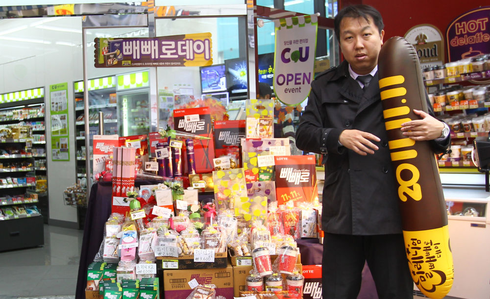 2014年11月11日,在韩国首尔,一名店员抱着一个pepero巧克力棒充气模型兜售巧克力棒。当天是韩国的“光棍节”,也称 “Pepero Day”。(新华社记者姚琪琳摄)