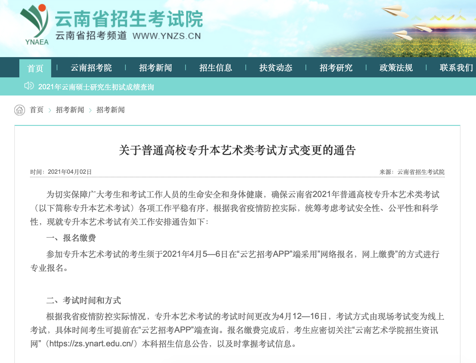 据了解,为确保云南省2021年普通高校专升本艺术类考试各项工作平稳有序,根据疫情防控实际,统筹考虑考试安全性、公平性和科学性,参加专升本艺术考试的考生须于2021年4月5—6日在“云艺招考App”采用网络报名、网上缴费的方式进行专业报名。报名缴费完成后,考生应密切关注“云南艺术学院招生资讯网”本科招生信息公告,以及时掌握考试信息。