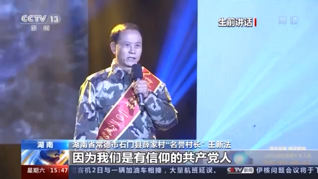 (生前讲话)湖南省常德市石门县薛家村“名誉村长” 王新法:许多关注我们的朋友都在问,为什么来湖南,为什么在薛家村,你们这么干图的是什么?今天,我就想用已经做过的事实告诉大家,因为我们是有信仰的共产党人,因为我们是忠诚于自己的国家和人民的军人。