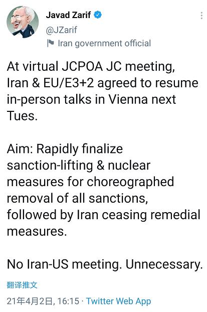 此前,伊朗外长扎里夫在社交平台发文表示,维也纳会谈将迅速敲定解除对伊制裁,此后伊朗将停止减少履约的措施。他强调不会有美伊对话,因为没有必要。