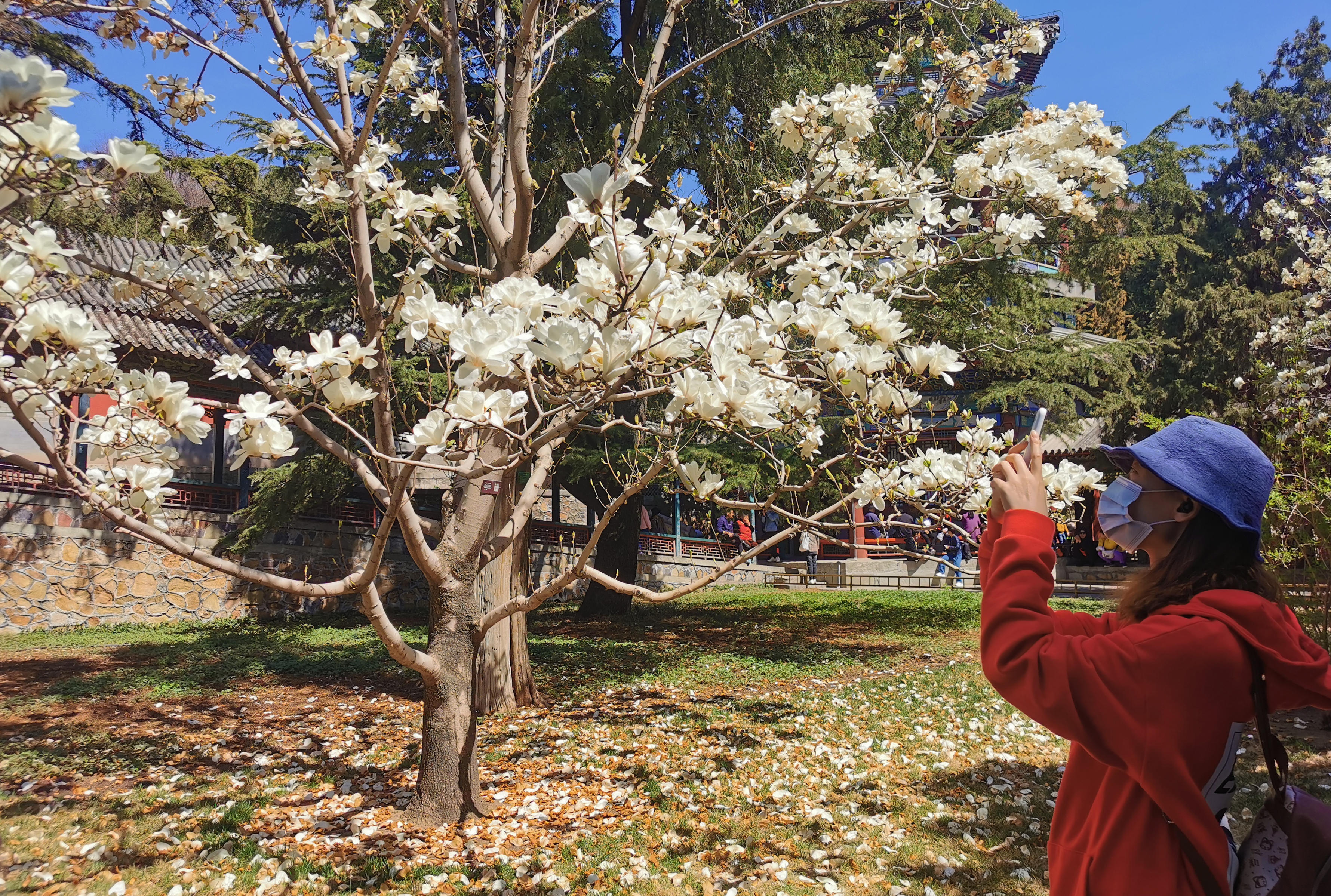 ↑游客在颐和园内拍摄玉兰。(杨淑君摄)