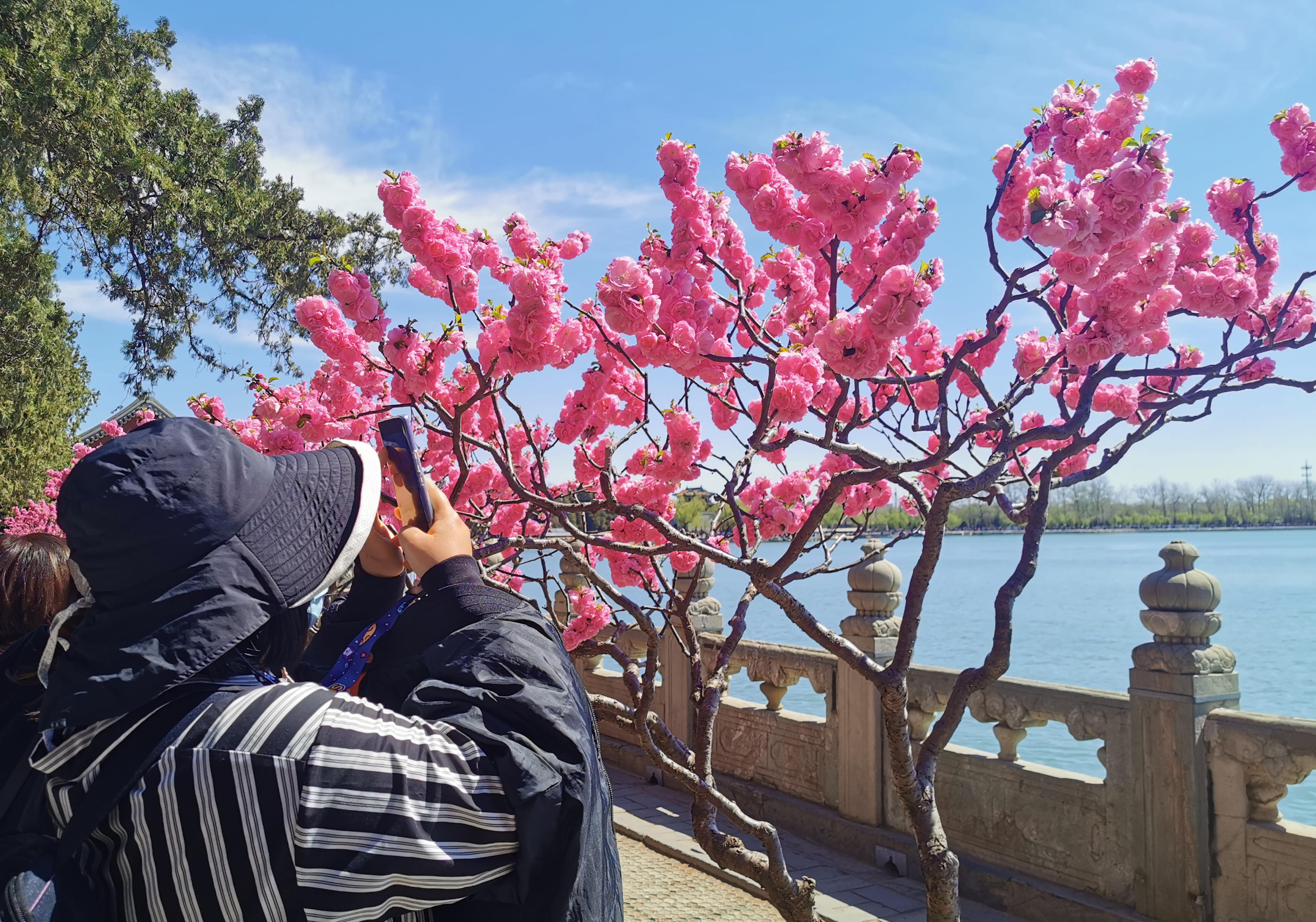 据介绍,本周正是长廊沿线榆叶梅的盛花期,游客走在颐和园昆明湖畔可欣赏到春花烂漫。此外,万寿山东侧紫气东来城关附近的梅花、中御路的连翘也都花满枝头。