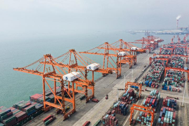 这是2019年11月23日拍摄的中国(广西)自由贸易试验区钦州港片区的集装箱码头。(无人机照片,新华社记者曹祎铭摄)