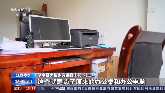 修水县大椿乡党委副书记 刘三峰:这就是我们的扶贫工作站,这个就是贞子原来的办公桌和办公电脑。