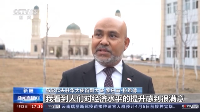 马尔代夫驻华大使馆副大使 索巴赫·拉希德:这几天在新疆走访,我对新疆老百姓生活的改变印象深刻,我看到人们对经济水平的提升感到很满意,也可以看到各族群众安居乐业。我们认为这得益于中国政府正确的、亲民的领导。