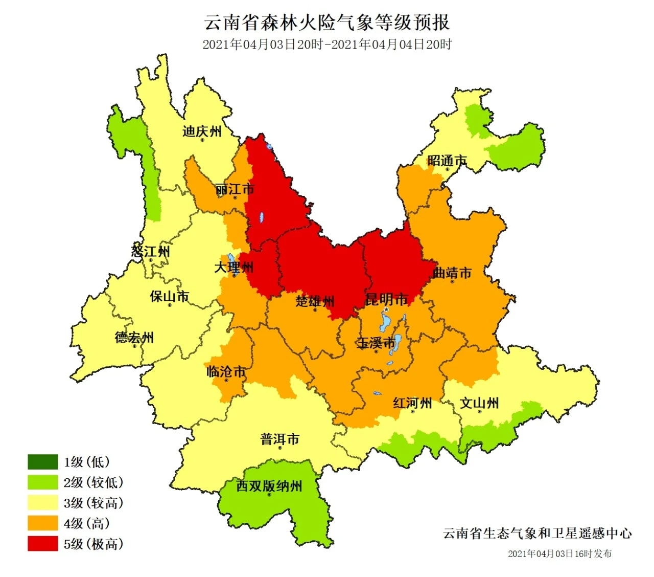 据预报,未来24小时,丽江东部、大理东北部、楚雄北部、昆明北部的森林火险气象等级极高,为5级;丽江西部、大理中部、临沧东北部、普洱北部、昆明南部、楚雄南部、玉溪、昭通南部、曲靖、红河北部、文山北部4级;迪庆、怒江南部、大理西部、德宏、保山、临沧大部、普洱大部、红河中部、文山中部、昭通中部3级;其它地区1~2级。