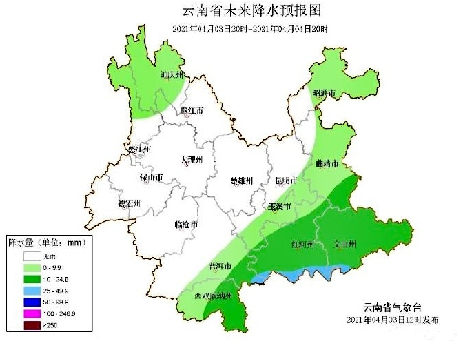 据云南省气象台4月3日预报,受西南气流影响,预计4月4日至6日,滇东南、滇南地区将迎来强降水、强对流天气过程,局地还将出现雷暴、大风、短时强降水、冰雹等极端天气,而云南省内大部地区也会有阵雨光顾。