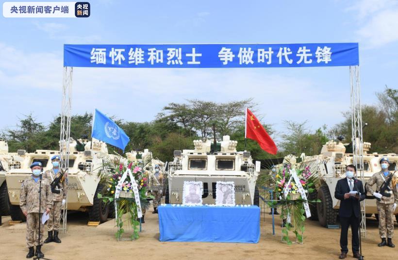 当地时间4月3日,中国第7批赴南苏丹(朱巴)维和步兵营官兵在联合国驻南苏丹特派团中国营举行烈士缅怀纪念活动,缅怀在南苏丹任务区为捍卫和平而牺牲的李磊、杨树朋两位维和英烈。