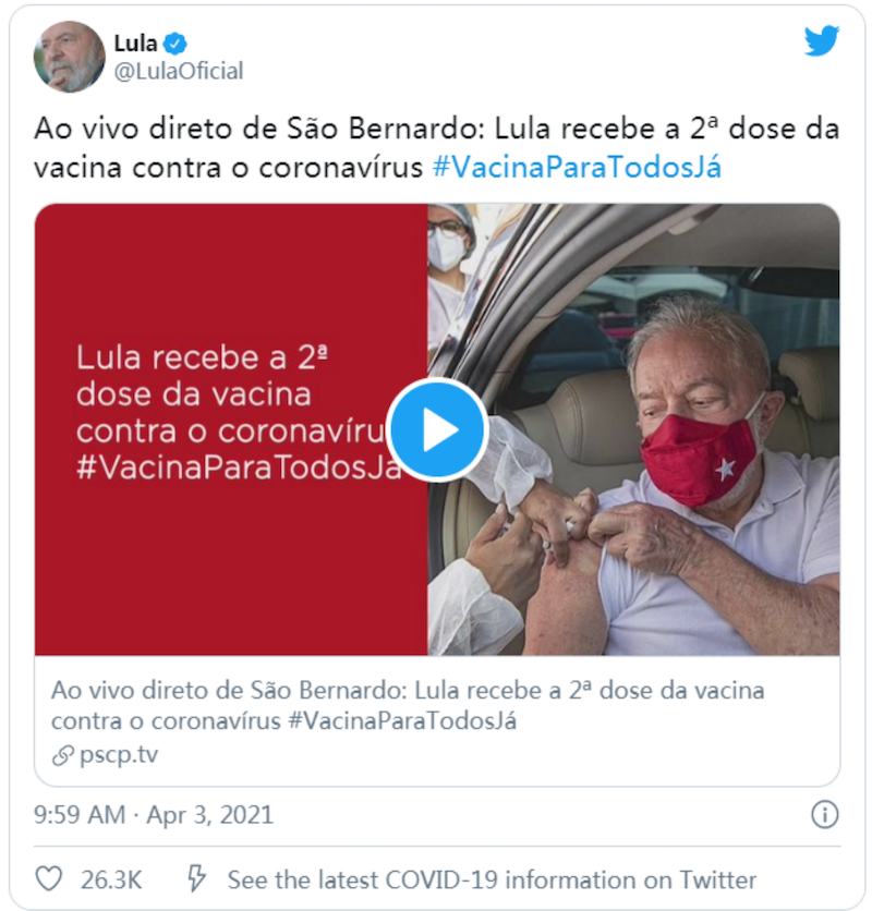 △巴西前总统卢拉接种第二剂中国新冠疫苗 来源:卢拉社交媒体账号