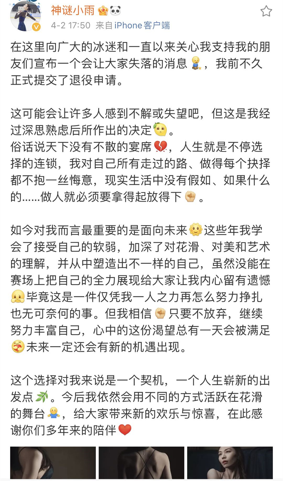 中国双人滑选手于小雨2日在微博上公布已于近期提交了退役申请。