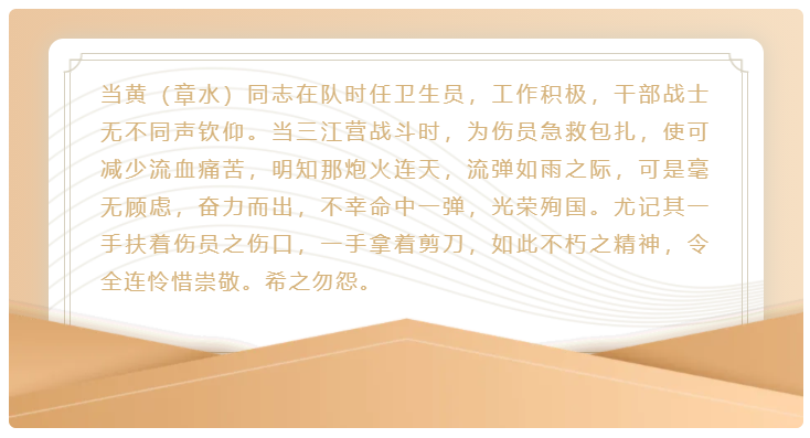 今年2月,三江营革命烈士纪念馆发起为67名烈士“寻亲”活动,活动发起后,很快得到社会各界响应。当年战斗的亲历者、担任三江营战斗179团一营3连指挥员的吴非远,吴老提供了一条重要线索:“牺牲在三江营的卫生员黄章水,是浙江诸暨人。”