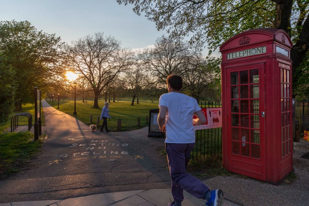 图为2020年4月11日,在英国伦敦,一名男士从红色电话亭旁跑过。(新华社记者韩岩摄)