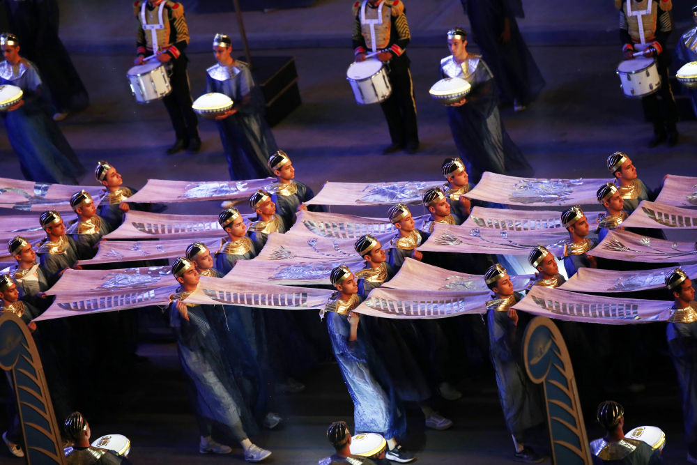 这是4月3日在埃及首都开罗木乃伊转移现场的文艺演出。(新华社发,艾哈迈德·戈马摄)