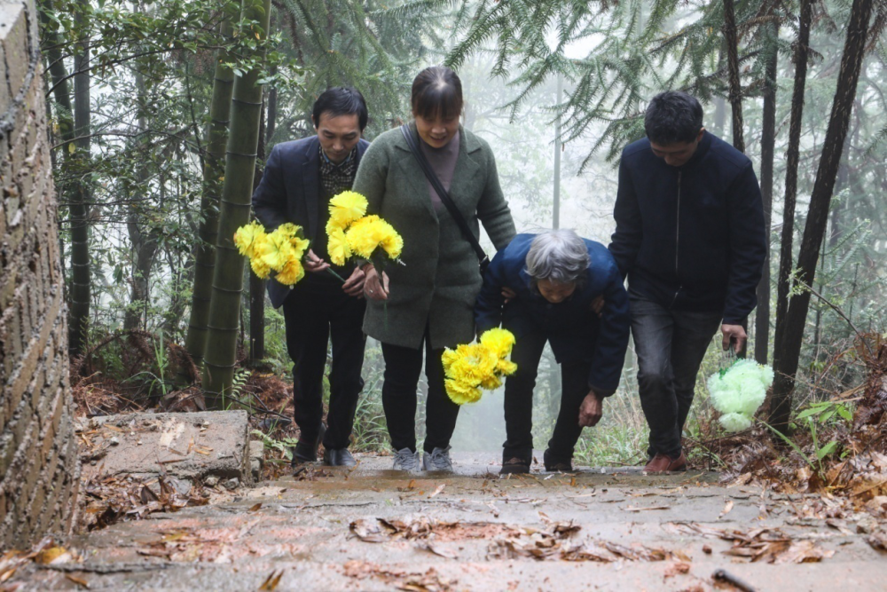 图为曾先华老人在儿媳凌端华和其他家人的搀扶下,前往烈士墓祭扫。报道员吴亚芬摄