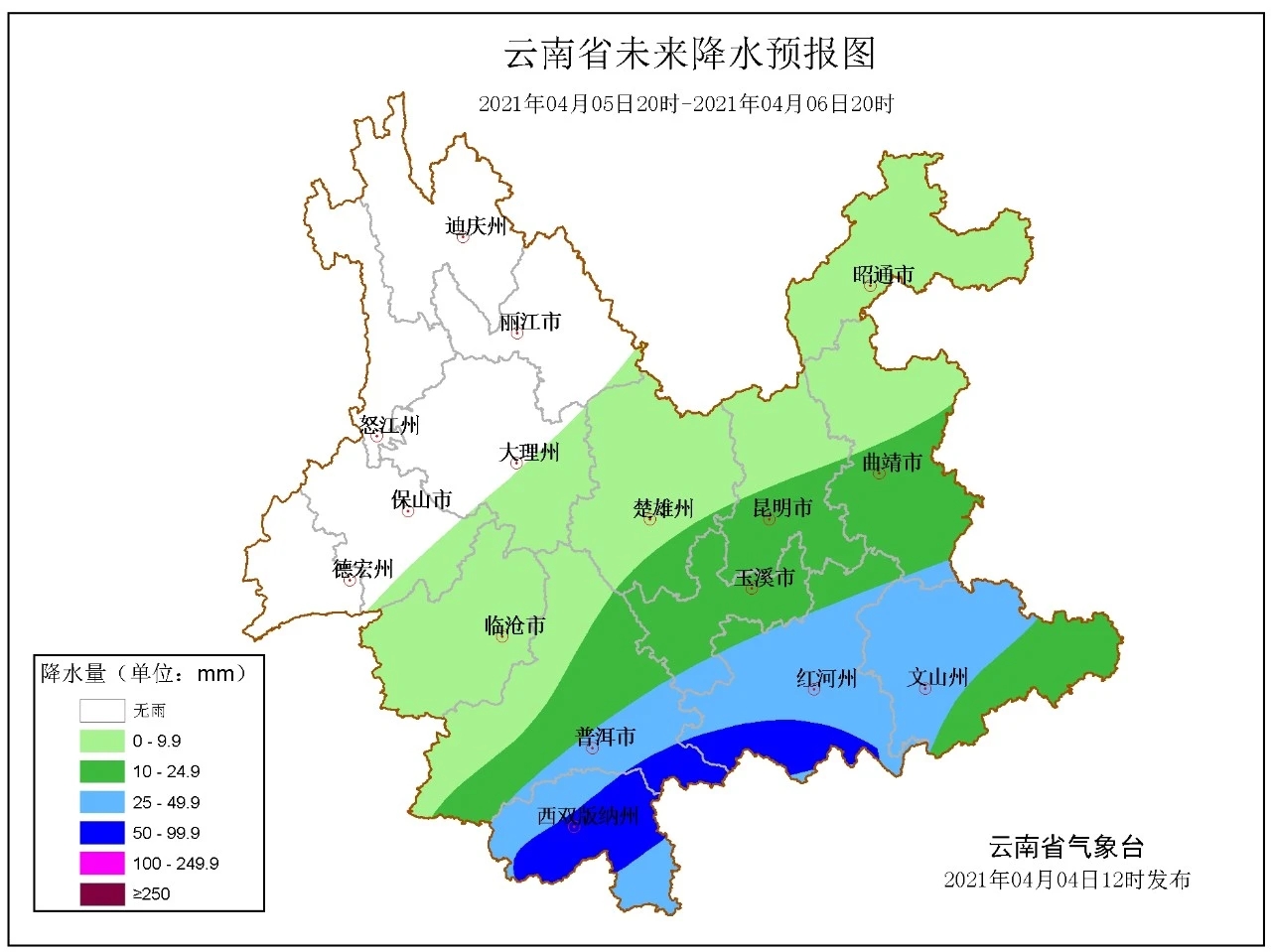 据预报,4月4日20时至4月5日20时,曲靖南部、文山、红河、普洱南部、西双版纳多云间阴有中到大雨局部暴雨,昭通北部、曲靖北部、昆明南部、玉溪、普洱北部、临沧南部、迪庆、怒江、保山西部、德宏多云有阵雨局部中雨,其他地区多云局部有阵雨。4月5日20时至4月6日20时,曲靖南部、文山、昆明南部、玉溪、红河、普洱南部、西双版纳多云间阴有中到大雨局部暴雨,昭通、曲靖北部、昆明北部、楚雄、普洱北部、临沧、大理东南部多云有阵雨局部中雨,其他地区多云局部有阵雨。