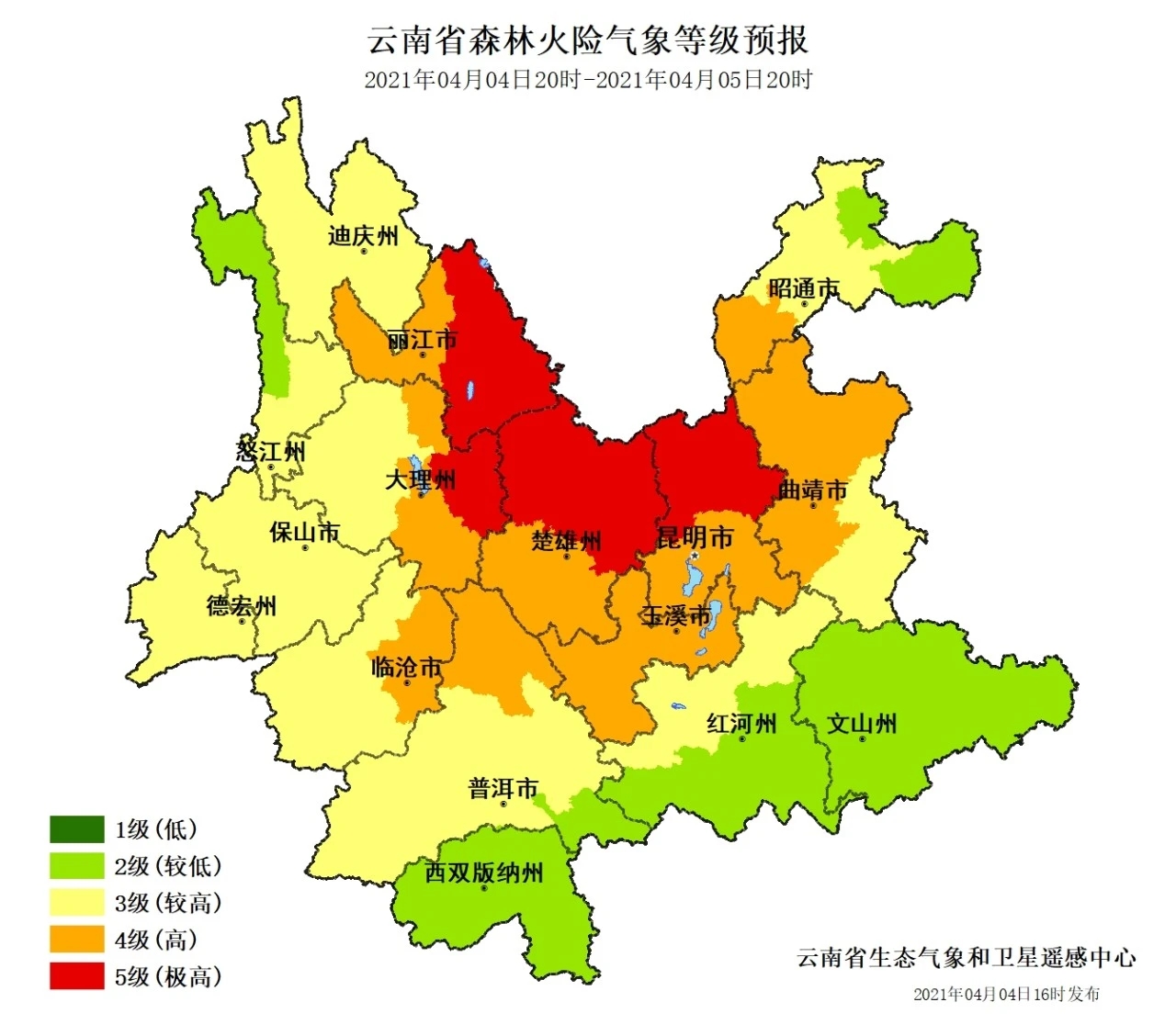 此外,云南部分地区依然维持高等级森林火险。据预报,未来24小时,丽江东部、大理东北部、楚雄北部、昆明北部的森林火险气象等级为5级(等级极高);丽江西部、大理中部、临沧东北部、普洱北部、昆明南部、楚雄南部、玉溪、昭通南部、曲靖北部和中部4级(等级高),迪庆、怒江南部、大理西部、德宏、保山、临沧大部、普洱大部、红河北部、昭通中部、曲靖南部3级(等级较高),其他地区1~2级。